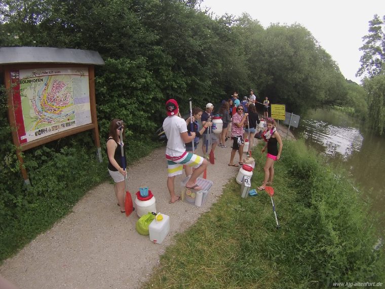 Wir (7 ehrenamtliche Gruppenleiter*innen und 8 Teilnehmer*innen) starteten mit riesiger Vorfreude in der Früh um 8 Uhr am Bahnhof Fischbach. Dort verluden wir unser Gepäck auf den Anhänger und machten uns mit einem kleinen Marschgepäck für unterwegs auf den Weg zum Hauptbahnhof Nürnberg. Das Wetter war noch ein wenig trügerisch, besserte sich jedoch im Verlauf des Tages zusehends. Dieses Jahr erwischten wir den Anschlusszug nach Treuchtlingen auf den ersten Anhieb (das Jahr zuvor mussten wir uns der Uhr geschlagen geben und eine Stunde am Hauptbahnhof verweilen, bis der nächste Zug eintraf) und unsere Reise nahm weiter Fahrt auf. In Treuchtlingen angekommen wechselten wir ein zweites Mal den Zug und fuhren in Richtung Solnhofen, unserem Endpunkt der letztjährigen Kanu-Tour. Hier mussten wir gezwungenermaßen eine kleine Pause einlegen, da der Boots-Verleiher noch nicht vor Ort war. Dies nutzen einige um sich beim ortsansässigen Metzger mit Leckereien zu versorgen. Mit dem Eintreffen der Kanus gab es einen kurzen Moment der Uneinigkeit, wie man diese besetze, aber dieser wurde schnell geklärt. Ausgestattet mit Schwimmweste und Paddel ging es dann zur Anlegestelle. Nachdem die Verpflegung, der Erste-Hilfe-Koffer und natürlich das kleine Gepäck sicher in den Kanus verstaut war ging es schon auf die Altmühl.