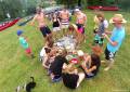 Da die Altmühl ja als reissender Strom bekannt ist, wobei man die Fließgeschwindigkeit auf ein Minimum definiert, mussten wir uns von Beginn an kräftig ins Zeug legen um pünktlich zur Mittagspause in Hammermühle anlegen zu können. Dort angekommen waren alle sofort von der anstehenden Bootsrutsche gefesselt (ja man rutscht tatsächlich in einem Boot durch eine Engstelle im Fluss). Nachdem Brot, Wurst, Obst und Gemüse aufgeschnitten und der Eistee bereitgestellt war, galt es die verbrauchten Kalorien wieder aufzufüllen. Da die Sonne sich zu diesem Zeitpunkt von ihrer besten Seite zeigte, nutzen manche die Pause zum ausgiebigen Sonnenbaden und natürlich zum Kräfte tanken. Danach stand das erste kleine Highlight an, die oben erwähnte Bootsrutsche, es machten sich alle Boote (wenn auch teilweise nur in kleiner Besetzung) auf in die Fluten. Die Angst zu kentern war zwar vorhanden, andere vor uns zeigten uns wie man es nicht macht und so kamen alle Boote durch dieses Nadelöhr. Dennoch war es eine nasse Angelegenheit und man musste nach der Durchfahrt das Boot von überflüssigem Wasser befreien. Dann ging es weiter richtung Dollnstein, als wir dort bei strahlendem Sonnenschein angekommen waren, luden wir unser Gepäck und die Zelt vom Anhänger.